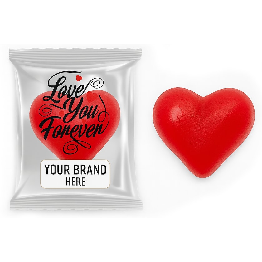 Großes Geleeherz in Verpackung bedrucken. Wählen Sie zwischen einer einfarbigen weißen oder transparenten Verpackung. Ein geschätztes Geschenk für jemanden, der Ihnen wichtig ist.