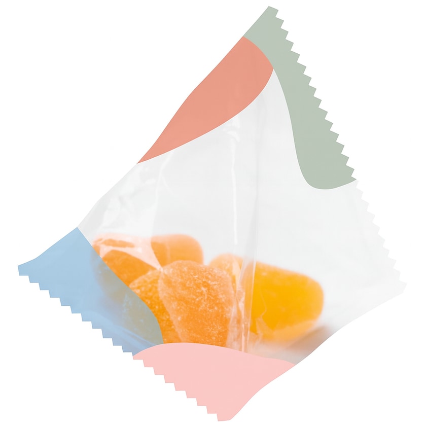 Pyramide mit Geleebonbons. Die Pyramide enthält eine wunderbare Mischung aus Geleebonbons mit Orangen- und Zitronengeschmack. Die gesamte Verpackung wird nach Ihren Wünschen bedruckt. Sie wählen, ob Sie die Pyramide aus transparentem oder durchgefärbtem Material haben möchten.