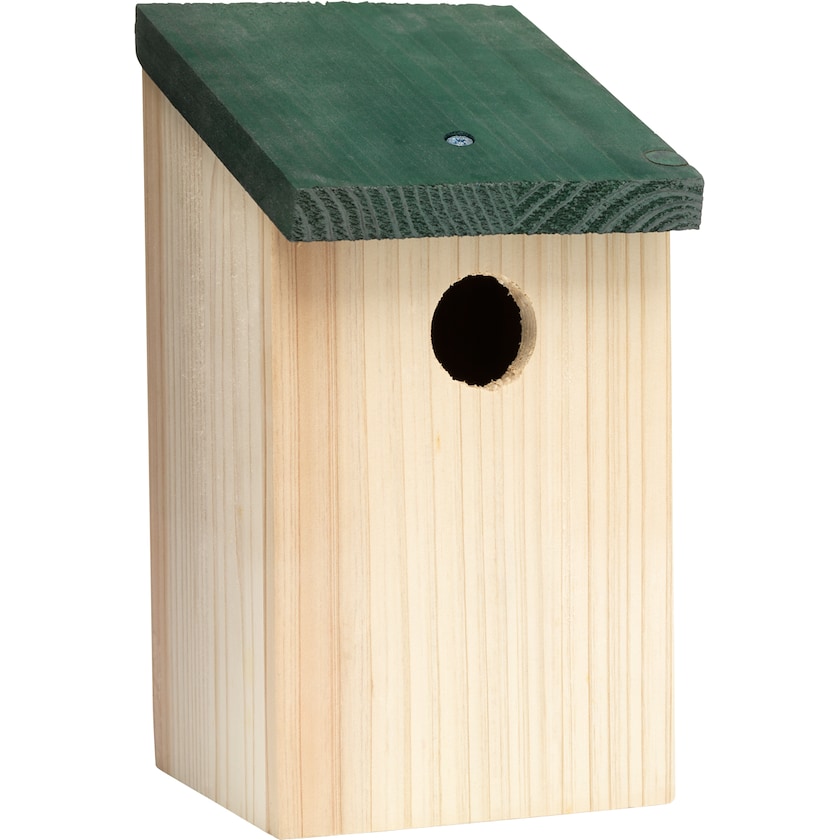 Vogelhaus aus echter Kiefer. Ideal für kleine Vögel wie Spatzen und Meisen. Das Dach kann geöffnet werden und an der Rückseite befindet sich eine Aufhängeschlaufe. Funktioniert im Garten oder auf dem Balkon gleichermaßen gut.