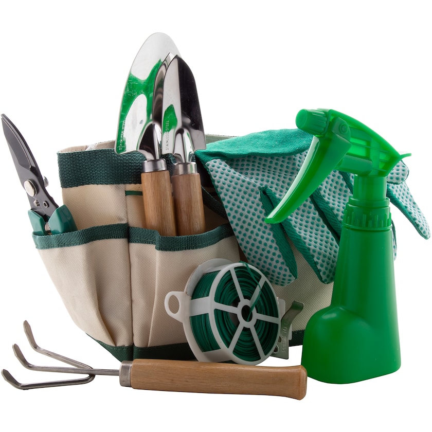 Alles was man für eine Gartenpflege benötigt. Das Set besteht aus einer Tasche, einer Gartenschere, einer Gabel, zwei Gartenschaufeln, einen Gartendraht mit Messer, eine Sprühflasche und ein Paar Gartenhandschuhe.