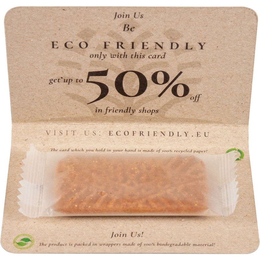Leckerer Keks mit Karamellgeschmack auf einer naturfarbenen Pappkarte. Die Verpackung ist biologisch abbaubar. Die Pappkarte ist perforiert, so das sie einfach abgerissen werden kann und z. B. als Rabattcoupon benutzt werden kann.