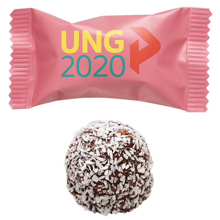 Kleine Schokokugeln mit einzelner Verpackung. Die Schokokugeln haben einen leckeren Mokkageschmack und eine leckere Hülle aus Kakao und Kokos. Die gesamte Verpackung wird nach ihrem Wünschen bedruckt.