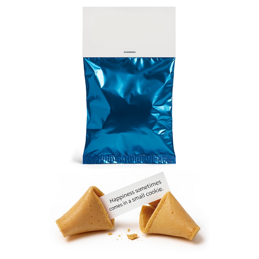 Glückskekse in Folie, verschlossen mit einer Karte im 4-Farbdruck. Die Folie ist in 8 Farben erhältlich (siehe Detailbild). Sie bestimmen bis zu 5 unterschiedliche Botschaften, die sich im Keks befinden. Ihre Botschaft kann 125 Zeichen inklusive Leerzeichen haben.