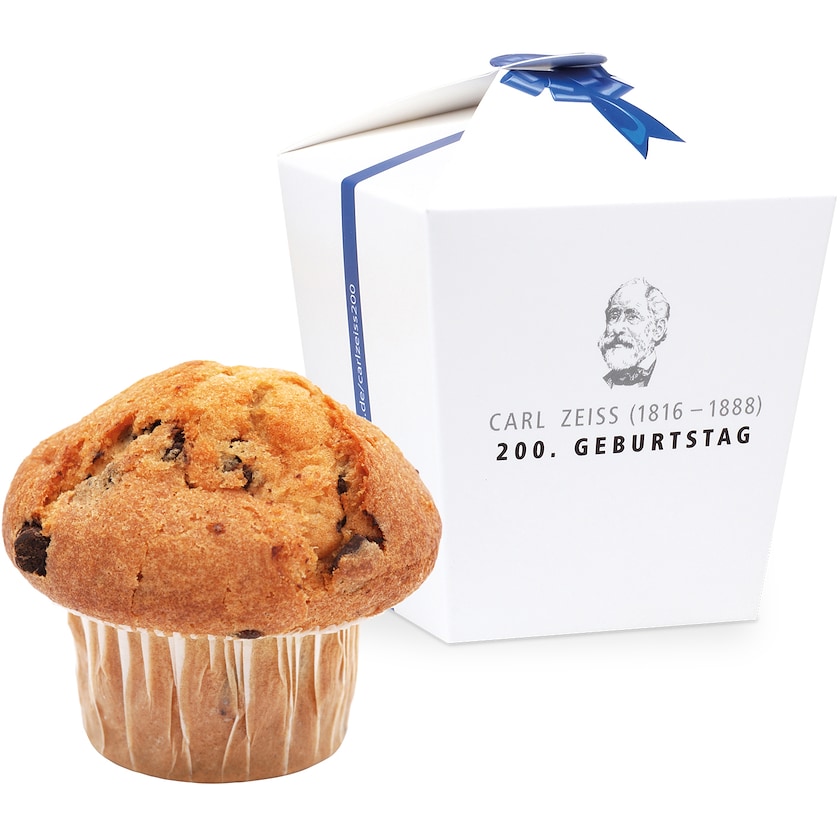 Großer Muffin in Pappschachtel mit 4-Farb-Fotodruck. Wählen Sie zwischen den Geschacksrichtungen Schokolade und Schokostückchen. Die ganze Verpackung wird nach Ihren Wünschen bedruckt. Unglaublich leckere Muffin!