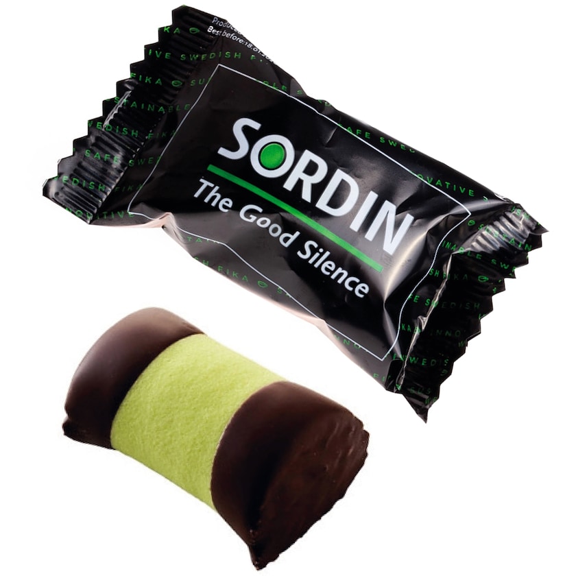 Kleine Punschrollen in einer Verpackung mit Logo bedrucken. Punschrollen sind aus Marzipan mit einer Arraknote in der Schokolade. Die gesamte Verpackung wird nach ihrem Wünschen bedruckt.