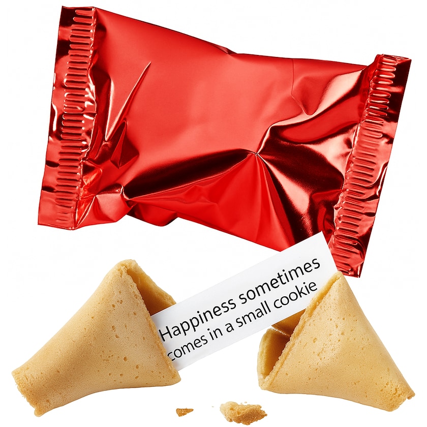 Glückskeks im Flowpack mit eigenem Druck. Wahlen Sie bis zu 5 verschiedene Botschaften, die in dem Keks gefunden werden sollen. Ihre Botschaft kann 125 Zeichen inklusive Leerzeichen haben. Bestellen Sie Glückskekse mit ihrer eigenen Botschaft bei Axon Profil. Der Druck auf dem Flowpack ist nur in schwarzer Farbe erhältlich.