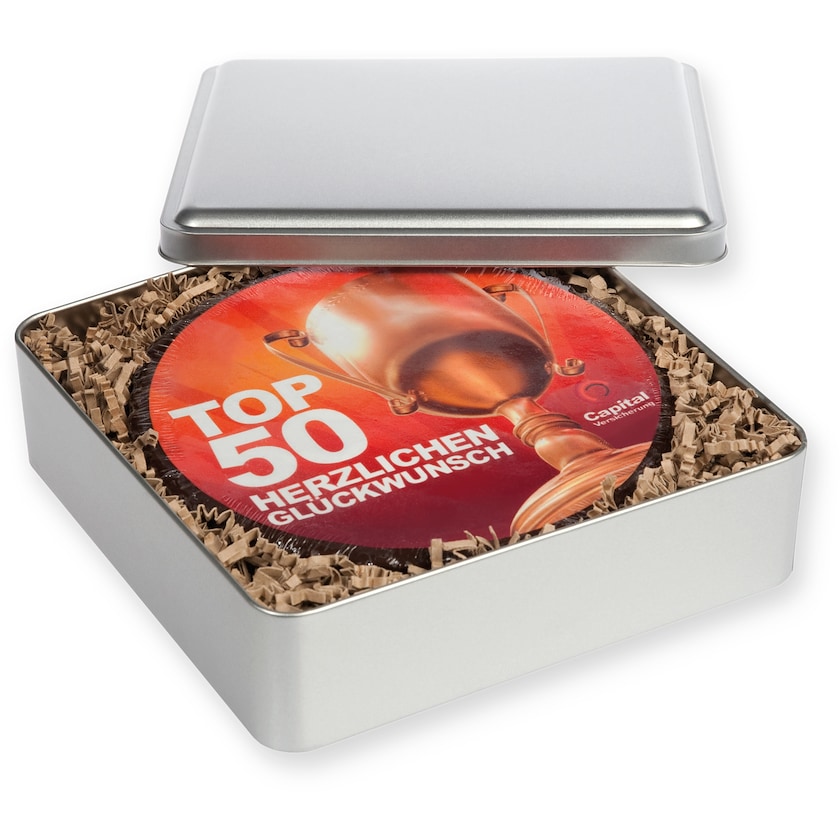 Großen Schokoladenkuchen bedrucken lassen. Der Druck erfolgt auf der Oberseite. Die gesamte Oberseite der Torte wird ganz nach Ihren Wünschen fotorealistisch bedruckt. Lieferung in einer exklusiven Metallbox.