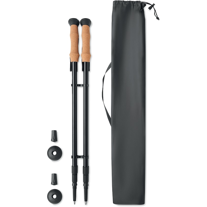 Verstellbare Wanderstöcke von höchster Qualität. Die Gehstöcke bestehen aus Aluminium und haben Korkgriffe. Die Länge kann zwischen 65 und 135 cm eingestellt werden. Die Lieferung erfolgt in einem rPET-Aufbewahrungstasche. Der Druck erfolgt auf der Tasche.