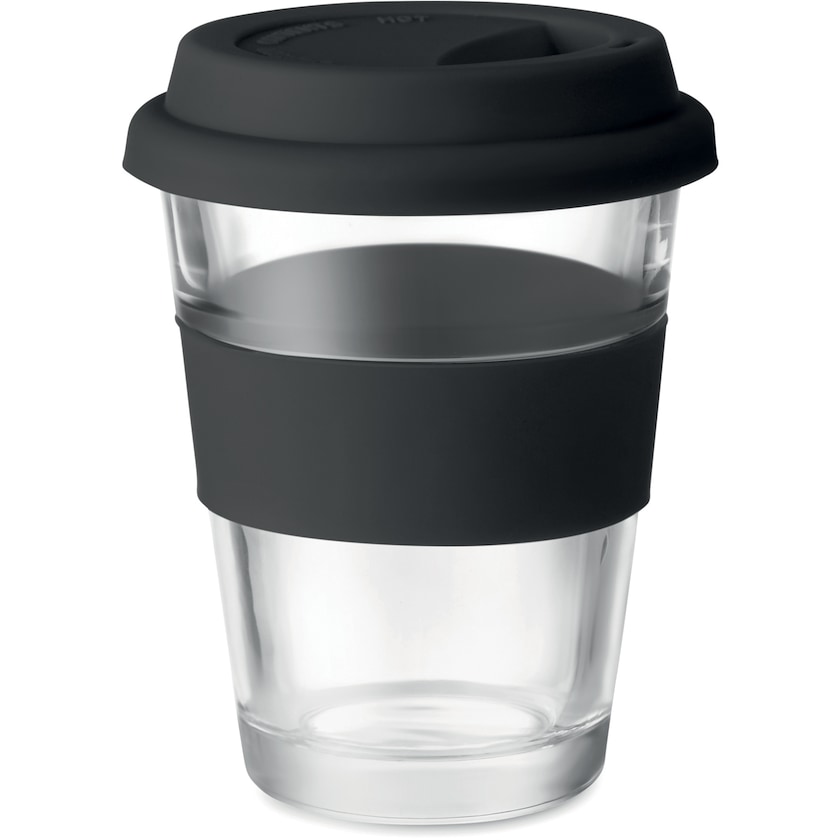 Glasbecher mit Verschluss und Grifffläche aus Silikon. Der Becher fasst 35 cl.