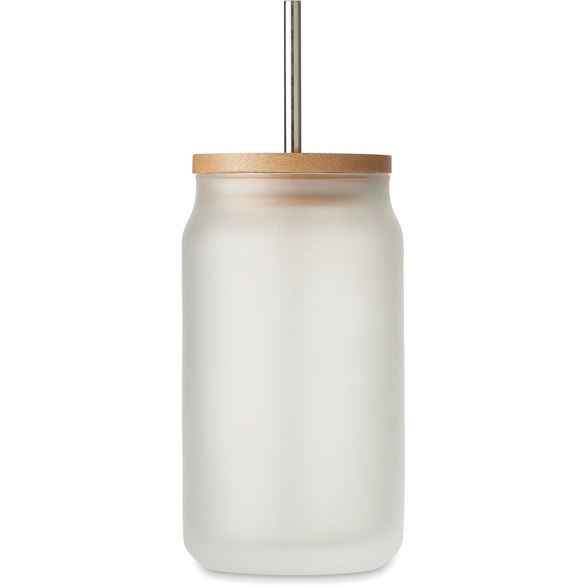 Glasbecher kann auf der gesamten Oberfläche bedruckt werden. Der Deckel ist aus Bambus und der Strohhalm aus rostfreiem Stahl gefertigt.