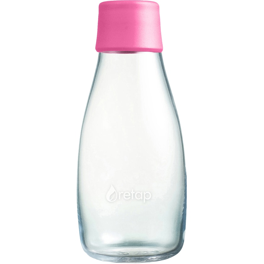 Kleine Retap-Glasflasche. Die Glasflasche fasst 30 cl und ist klein genug, um im Auto in den Becherhalter oder in die Handtasche zu passen. Die Flasche besteht aus Borosilikatglas, das stärker, hitzebeständiger und umweltfreundlicher als gewöhnliches Glas ist. Die Idee ist, Leitungswasser direkt aus der Flasche zu trinken und abgefülltes Wasser zu ersetzen. Die große Öffnung ist ohne Gewinde und der Silikon-ähnliche Korken schließt die Flasche sicher. Sowohl Glasflasche als auch der Verschluss können im Geschirrspüler gereinigt werden. Die Flasche kann mit und ohne vorgedrucktes Retap-Logo geliefert werden.