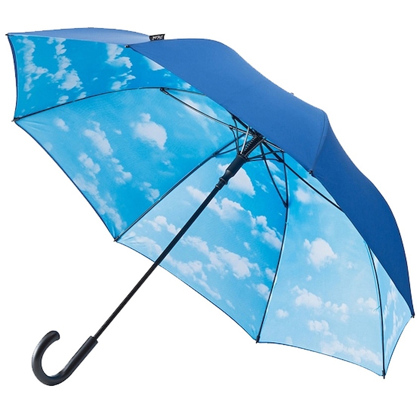 Großer, hochwertiger Regenschirm mit Wolkenmotiv im Inneren. Der Regenschirm hat eine Konstruktion aus Glasfaser, was ihn sehr stabil macht. Der Griff ist angenehm gummiert.