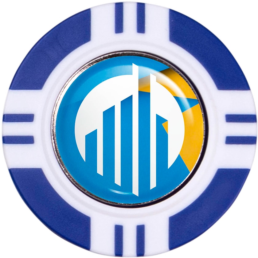 Ballmarker aus Metall, der in einem klassischen Pokerchip steckt. Der Druck erfolgt mit 4-Farb-Fotodruck, der unter einer schützenden Epoxy-Oberfläche platziert wird.