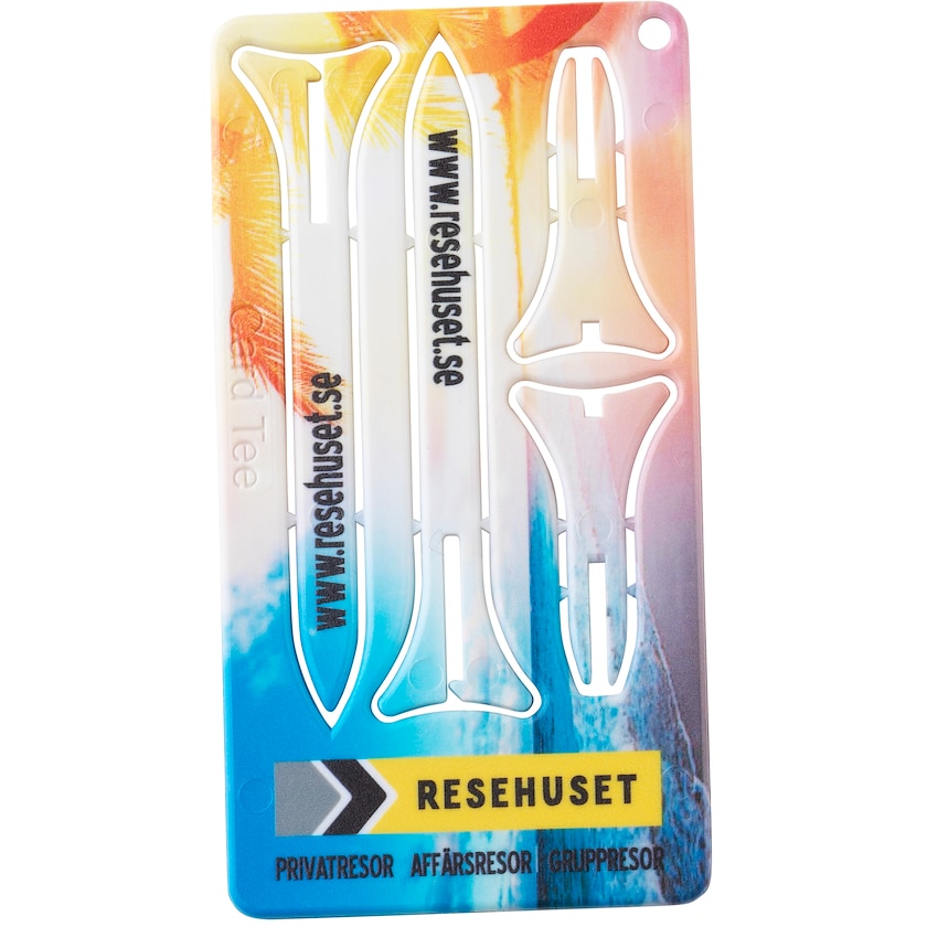 Plastikkarte, die sich zu zwei Tees zusammensetzen lässt. Eine perfekte Methode um zum nächsten Golfevent einzuladen! Die Teile werden rausgedrückt und lassen sich zu zwei 70 mm Golftees zusammensetzen. Der Druckpreis bezieht sich auf einseitigen Druck.