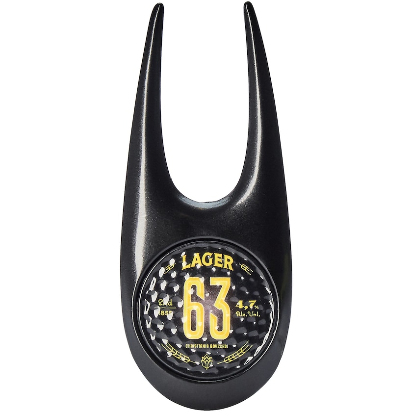 Pitchgabel aus Metall mit Ballmarker. Der Druck erfolgt im 4-Farb-Fotodruck auf dem Ballmarker. Der Ballmarker erinnert an einen Golfball.