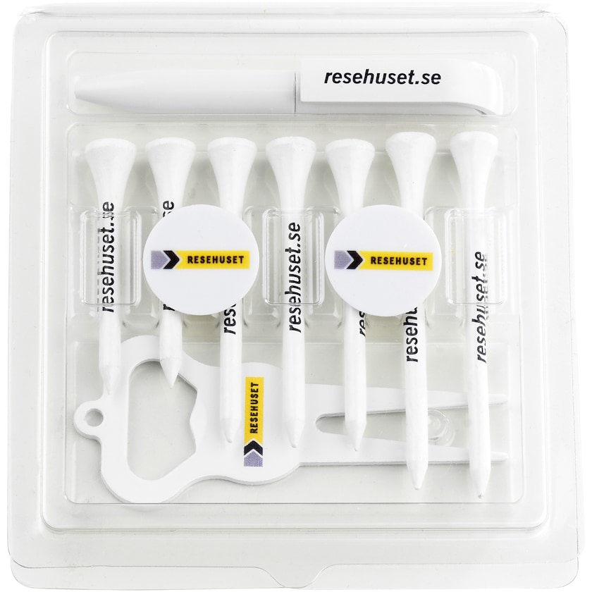 Golfzubehör-Set in stilvoller Geschenkverpackung. Das Set enthält sieben Holztees in drei verschiedenen Längen, zwei Ballmarker, eine Pitchgabel und einen Kugelschreiber. Der Druck wird auf allen Golfzubehörteilen angebracht.