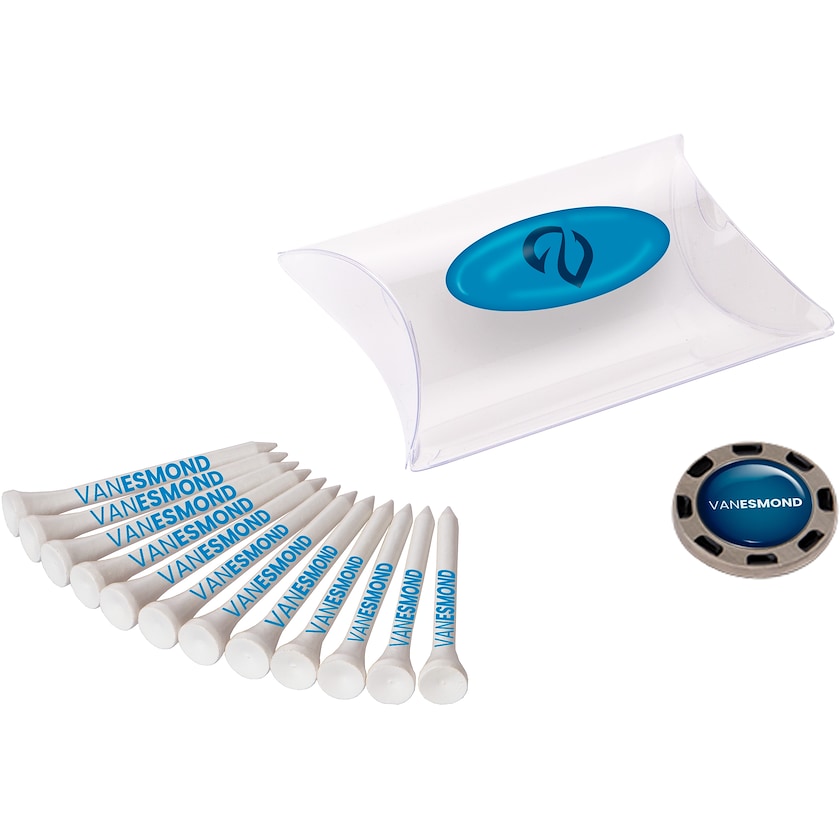 Set bestehend aus 12 Stk. 70-mm-Golftees und 1 Ballmarker. Der Druckpreis bezieht sich auf 4-farbigen Fotodruck auf die Verpackung, den Ballmarker und die Golftees. Die beiden erstgenannten Drucke werden unter einer schützenden Epoxidoberfläche platziert, die für eine hochwertige Anmutung sorgt. Ein perfektes Geschenk für alle Golfspieler!