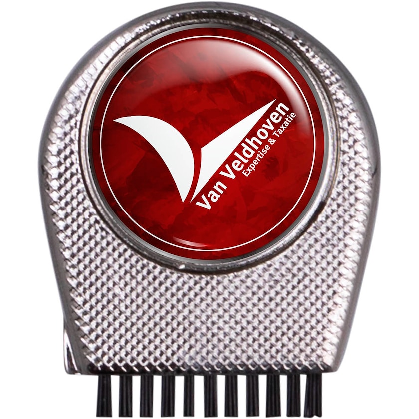 Schlägerreiniger aus Metall mit Ballmarker. Die Bürste ist aus Nylon. Der Druck wird auf dem Ballmarker platziert und wird Dank einer Schicht aus Epoxid geschützt.