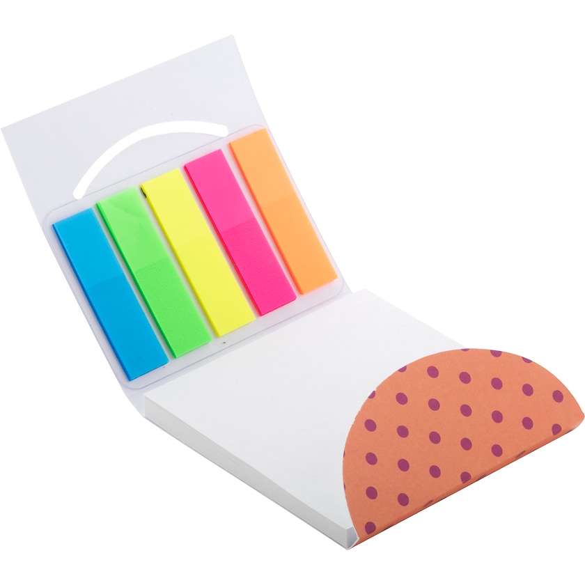 Faltbares Set mit Haftnotizen und Notizblock. Jedes Set umfasst 100 Haftmarker in fünf leuchtenden Farben (je 44 x 12 mm) sowie einen quadratischen Notizblock (75 x 75 mm) mit 50 selbstklebenden Blättern.