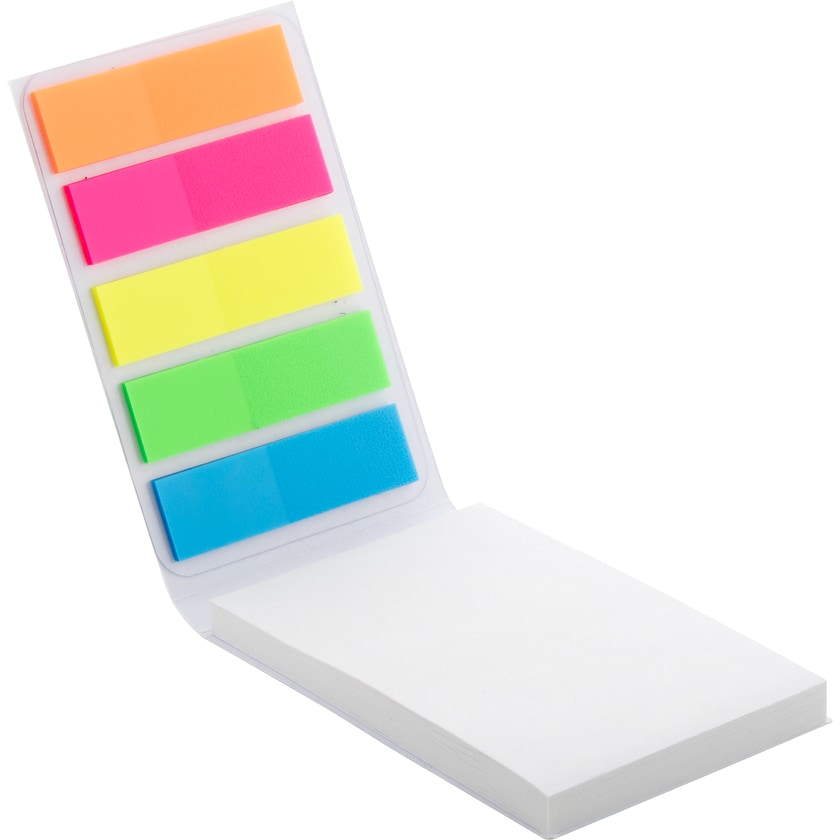 Set mit Markierstreifen und Notizblock. Das Set enthält 100 Haftmarker in fünf Farben (je 44 x 12 mm) und einen quadratischen Notizblock (75 x 75 mm) mit 50 Seiten und Kleberand an der kurzen Seite. Die Außenseite des Umschlags wird nach Ihren Wünschen digital bedruckt.
