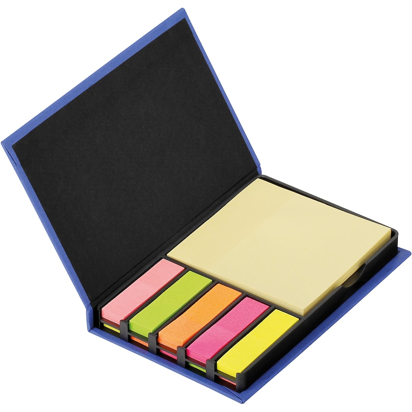 Set mit Haftstreifen und Notizblock. Lagos enthält 40 Haftstreifen pro Farbe, der Notizblock hat 40 Blatt. Ein perfektes Give away für Studenten!
