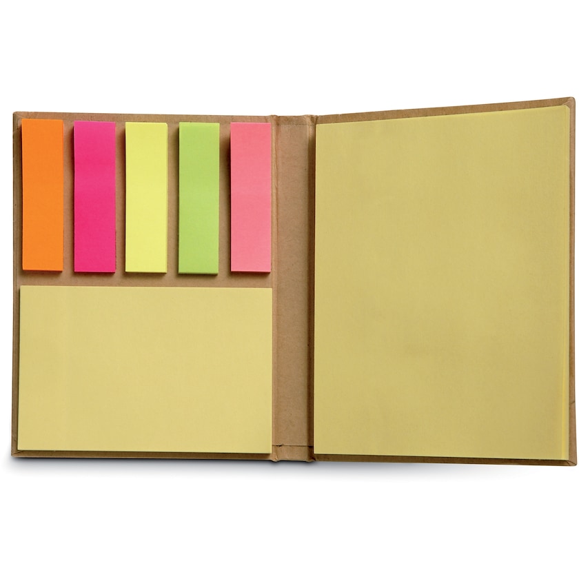 Haftmarker und Notizblock in Umschlag aus recyceltem Karton. Enthält 5x25 Haftmarker und 2 Notizblöcke mit 50 bzw. 25 Blatt. Bestellen Sie umweltfreundliche Haftmarker zum Bedrucken bei Axon Profil!