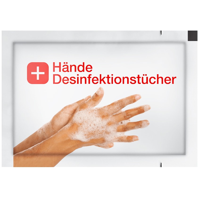 Feuchttücher mit Desinfektionsmittel. Sutton enthält Alkohol, der besonders effektiv darin ist, Bakterien und Viren zu töten. Die Feuchttücher sind für den einmaligen Gebrauch. Die ganze Verpackung wird nach ihren Wünschen bedruckt.