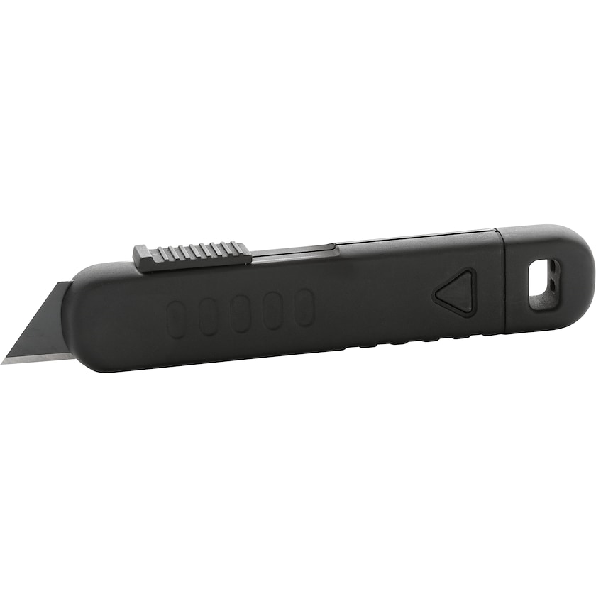 Schwarzes Teppichmesser von höchster Qualität. Die Klinge ist 18 mm, besteht aus Stahl und kann ausgetauscht werden. Ein formschönes Tepichmesser bedrucken.