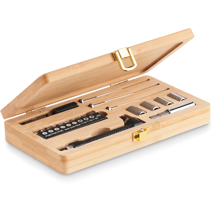 Hochwertiger Werkzeugkoffer. Die Toolbox enthält das Wichtigste für den Heimwerker. Der Werkzeugkasten selbst ist aus echtem Bambus.