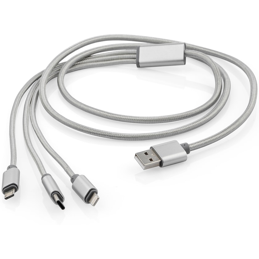 USB-Kabel mit drei verschiedenen Kontakten. Mega hat einen Typ C-Anschluss, einen Mikro-USB-Anschluss und Ausgang für iPhone 5 und spätere Modelle. Das Logo wird mit Lasergravur aufgebracht.