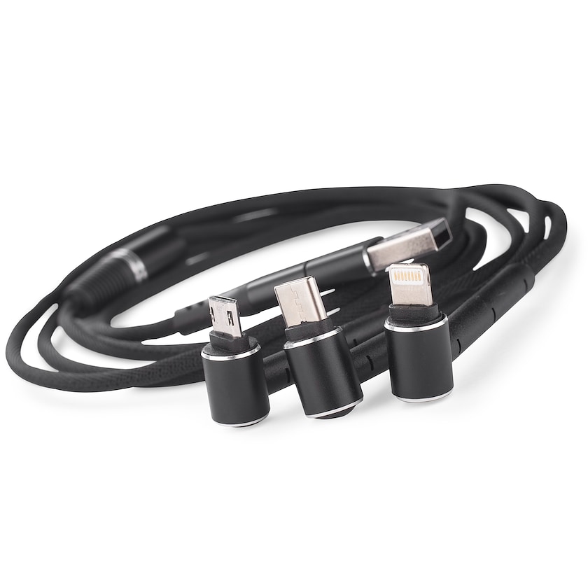 USB-Kabel mit sechs Funktionen in einem. Die Kabel haben zwei Inputs über einen USB-A- und eine USB-C-Stecker und drei Outputs über einen Micro-USB-, USB-C sowie einen Lightning-Stecker (iPhone). Die drei Output-Kabel sind verstärkt und können auch als Handystütze dienen.