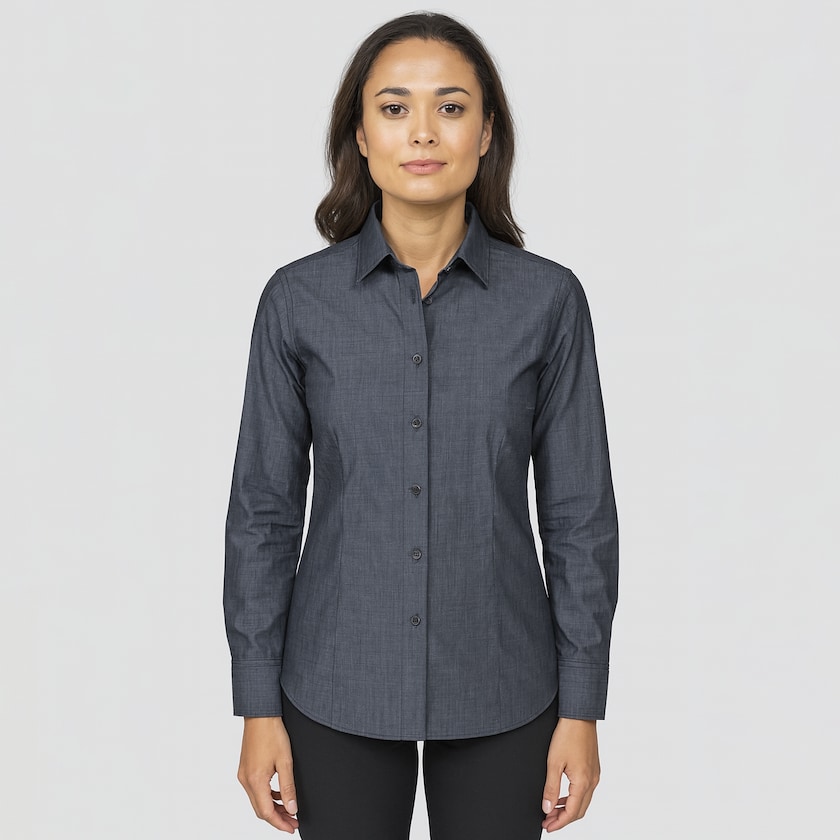 Langärmliges Damenshirt aus Bio-Baumwolle. Der Kragen ist vom Typ "semi-spread". Die Knöpfe sind perlmuttfarben. Gibt es auch als Herrenmodell.