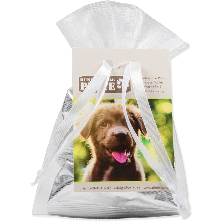 Hundesnack in Orgazabeutel. An dem Beutel wird eine Karte festgebunden, die nach ihren Wünschen bedruckt wird. Der Hundesnack ist von Happy Dog und eignet sich für Hunde ab 4 Monate.