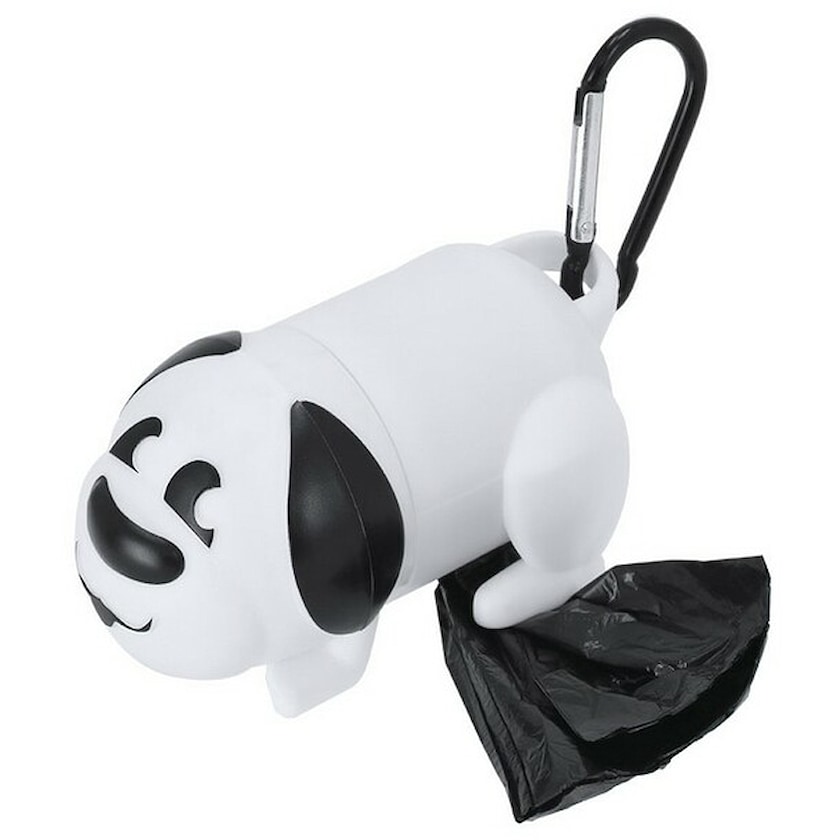 15 Doggy Bags in einem Behälter in Hundeform. Der Behälter ist mit einem Karabiner ausgestattet.
