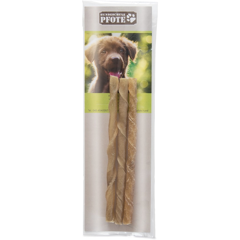 Dentalsticks für Hunde. In der Verpackung liegt eine Karte, die nach ihren Wünschen bedruckt wird. Dentalsticks helfen den Kiefer des Hudnes zu stärken und verbessern die Zahngesundheit.