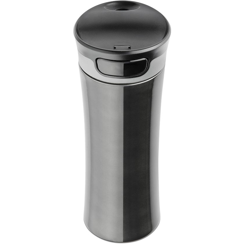 Moderner Thermobecher mit 40 cl Inhalt. Hält die Temperatur für bis zu 10 Stunden. Der Verschluss hat einen speziellen Knopf. Das Logo wird mit Lasergravur aufgebracht.