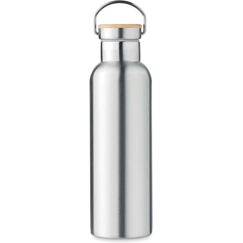 Elegante Thermosflasche mit Deckel mit Bambusverkleidung. Der Griff am Deckel erleichtert das Tragen der Flasche in der Hand. Sie können zwischen Druck und Lasergravur wählen.