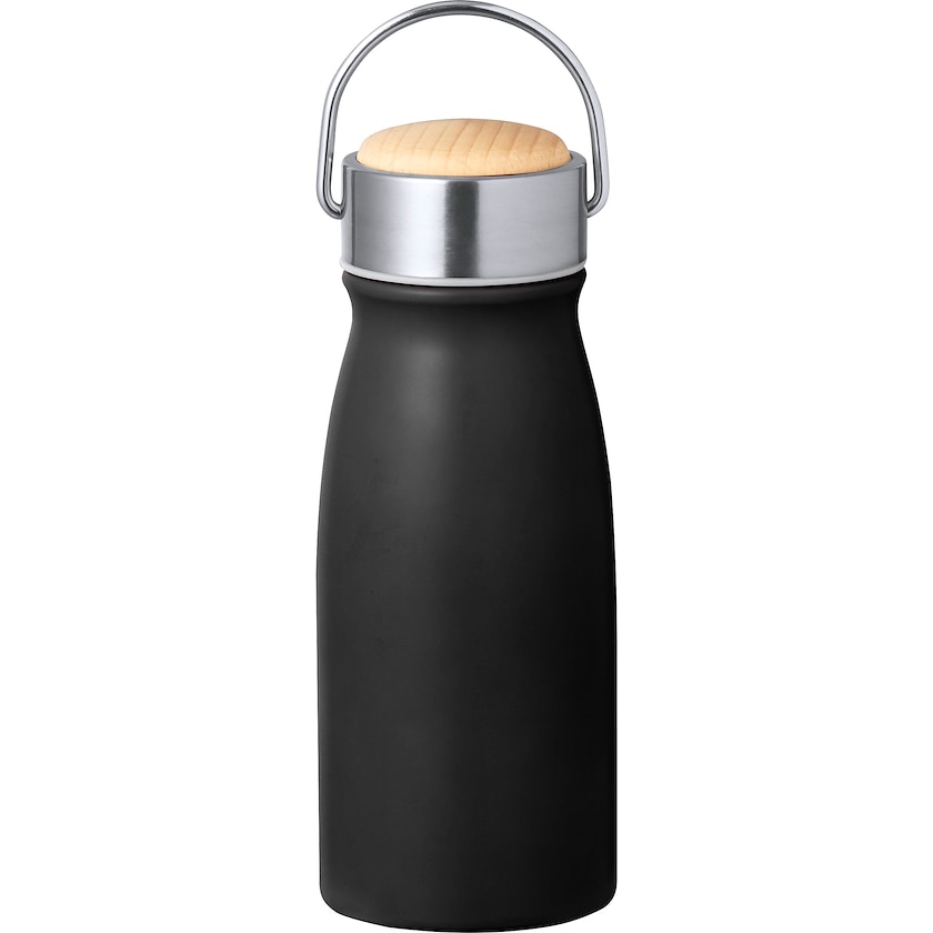 Kompakte Thermosflasche aus recyceltem Edelstahl. Rossburg fasst 35 cl. Die Oberseite des Deckels ist aus Holz gefertigt. Wählen Sie zwischen Druck oder Lasergravur.