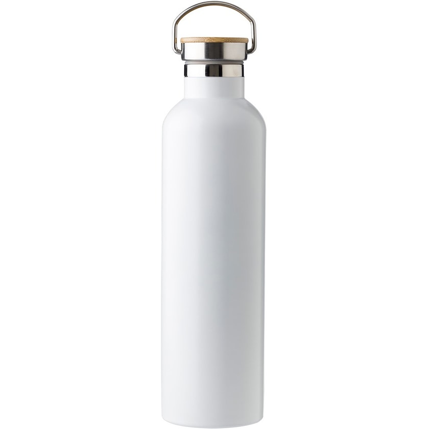 Große Thermosflasche aus rostfreiem Stahl. Die Thermosflasche hat doppelte Wände und ist vakuumisoliert. Die Oberseite des Deckels ist aus Bambus gefertigt. Eine schöne, hochwertige Thermosflasche.