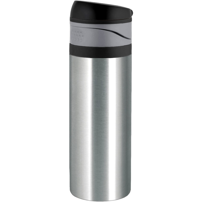 Eleganter Stahlthermobecher von Vildmark. Der Thermobecher hat einen bequemen Verschluss, der mit einer Hand geöffnet werden kann und mit dem ein ungewolltes Öffen nicht möglich ist.