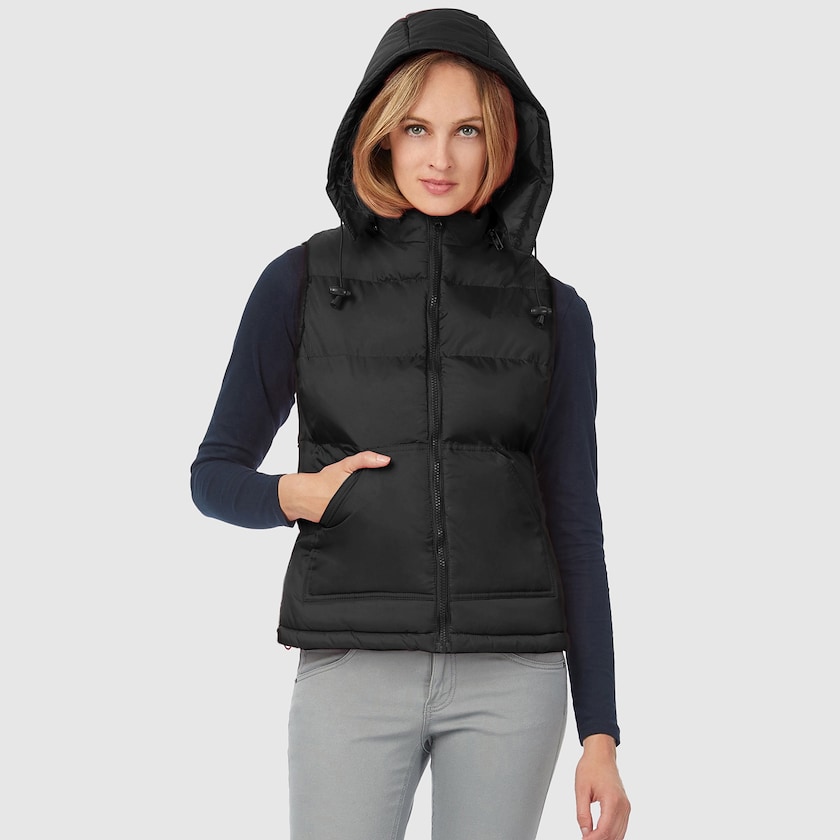 Hübsche Daunenweste für Damen von B&C. Die Daunenweste hat 2 Fronttaschen und eine abnehmbare Kapuze mit Reißverschluss. Die Daunenweste kann bedruckt oder bestickt werden. Das Außenmaterial ist aus Nylon und das Futter aus Polyester.