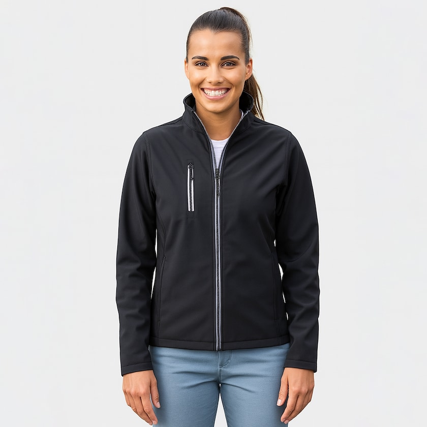 Softshell-Jacke für Damen mit superkurzer Lieferzeit. Die Jacke hat eine Brusttasche und zwei Seitentaschen. Auch als Herrenmodell erhältlich. Die Stickerei dauert etwas länger als der Druck. Gibt es auch als Herrenmodell.