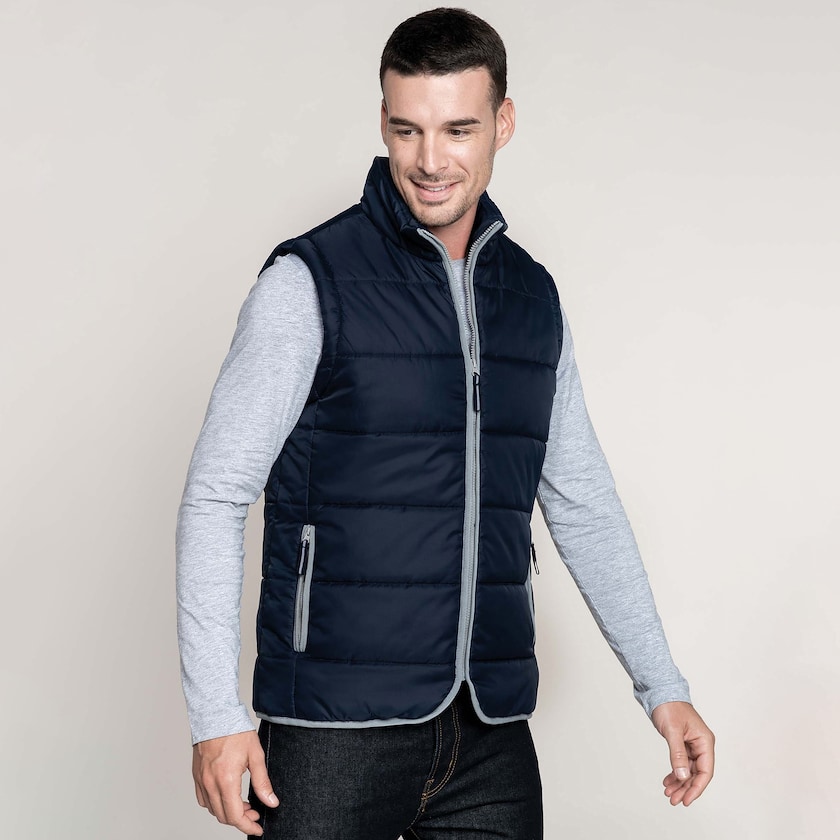 Wattierte Weste, in vielen verschiedenen Farben erhältlich. Die Weste hat graue Reißverschlüsse, der für ein charakteristisches Aussehen sorgt. Neben den beiden Seitentaschen gibt es eine Innentasche.