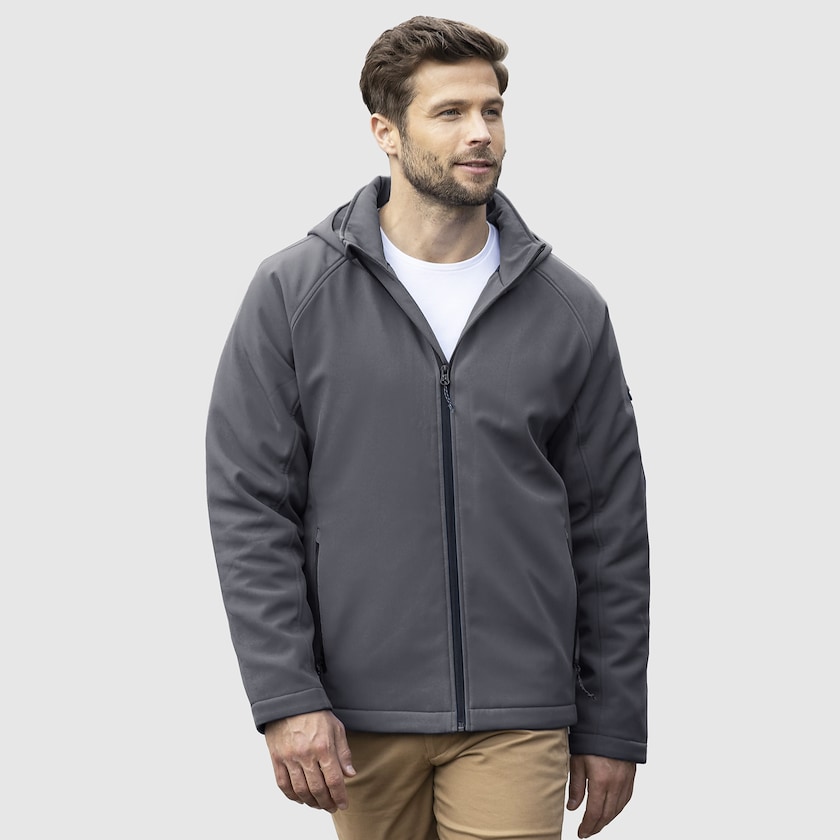 Softshell-Jacke für Männer. Die Jacke hat ein modernes Design mit einer abnehmbaren Kapuze. Seitentaschen und Ärmeltasche haben einen Reißverschluss. Innen befindet sich eine größere Innentasche. Gibt es auch als Damenmodell.