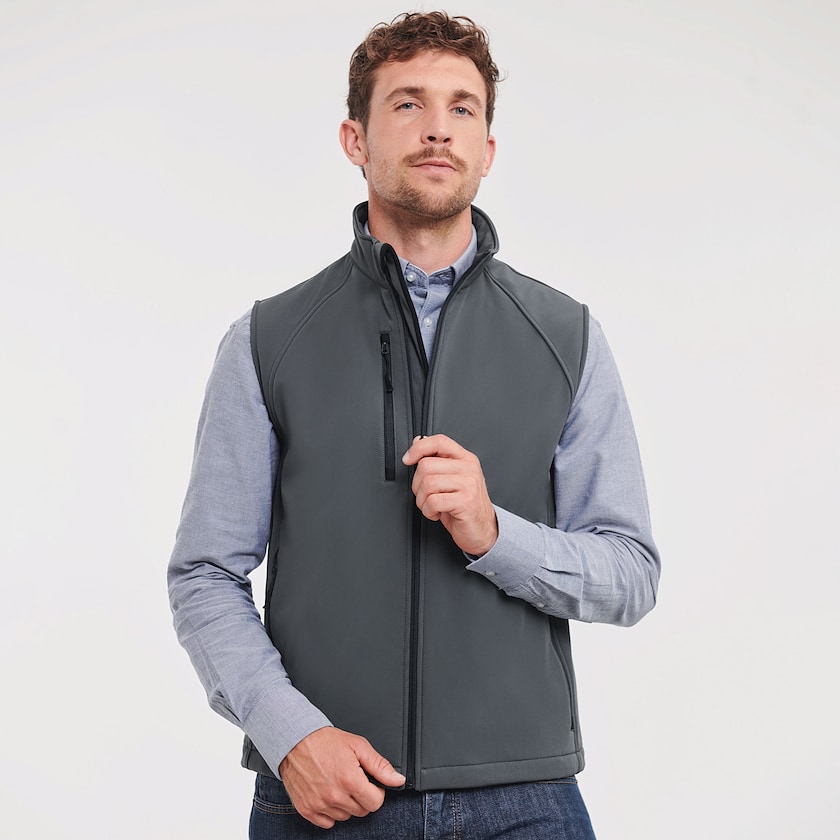 Körpernahe 3-Lagen-Softshellweste für Herren. Der Stoff hält sowohl Nässe als auch Wind effektiv stand und ist zudem atmungsaktiv. Die Weste besteht aus drei Schichten.