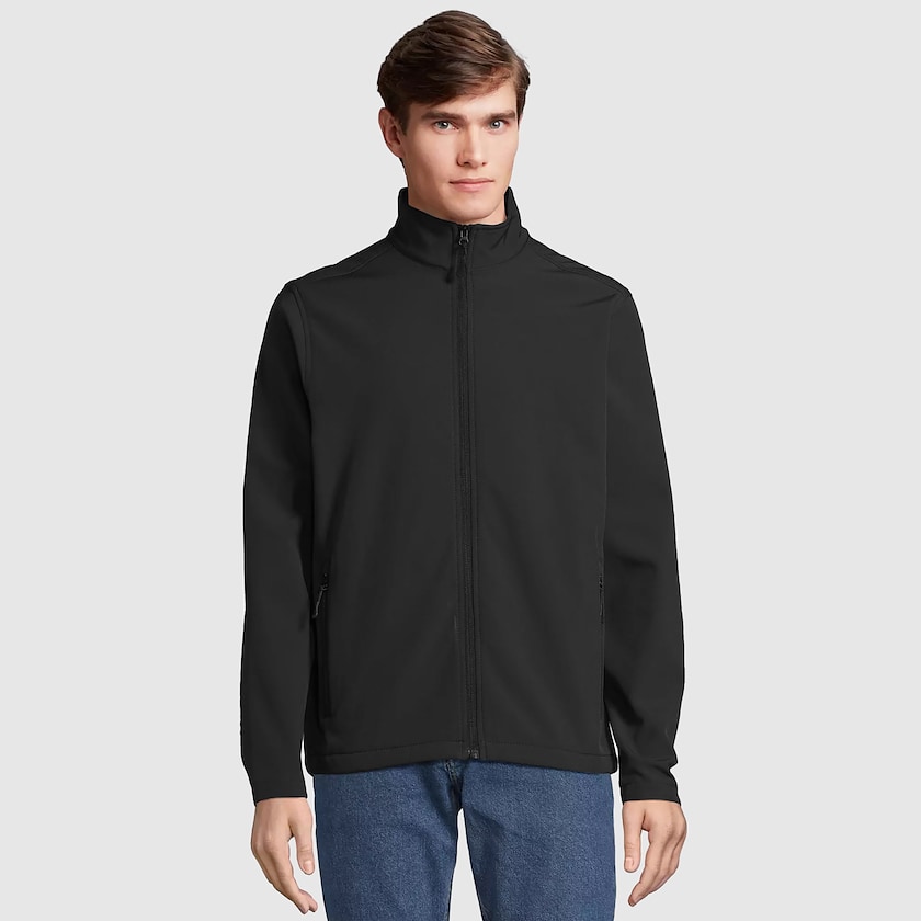 Sportliche Softshelljacke für Herren. An den Seiten befinden sich Reißverschlusstaschen. Der Stoff besteht aus zwei Lagen und besteht aus 96% Polyester und 4% Elasthan. Das Futter besteht aus 100% Polyester.