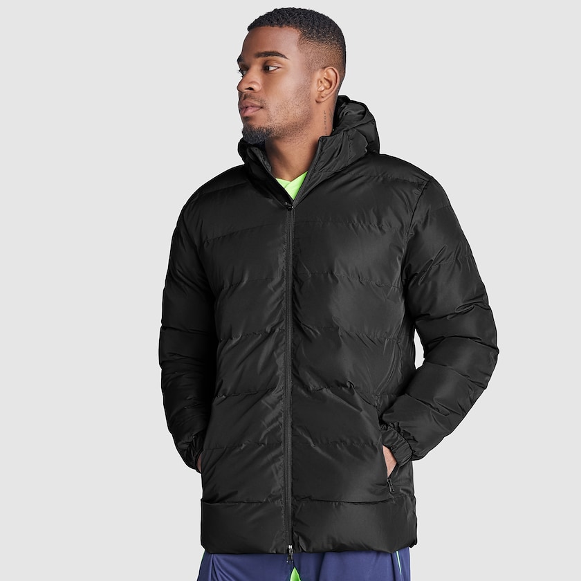 Schwere Daunenjacke mit Kapuze. Die Jacke hat zwei Seitentaschen mit Reißverschlüssen und eine Brustinnentasche. Wasser- und winddicht.