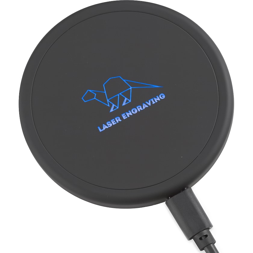 Kabelloses Ladegerät, bei dem Ihr Logo beleuchtet wird. Bei aktivem Ladegerät leuchtet die Lasergravur rot, blau oder weiß. Wählen Sie einfach die Farbe, die am besten zu Ihrem Unternehmen passt. Geliefert in einer schwarzen Geschenkbox. Kompatibel mit Qi-Standard.