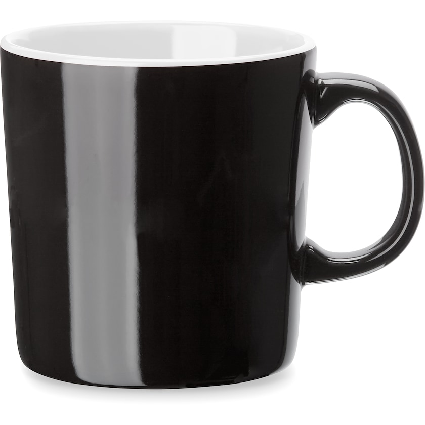 Schwarzer Becher mit farbigem Inneren. Innen und außen aus glanzendem Steingut, ist der Becher ein echter Hinkucker!