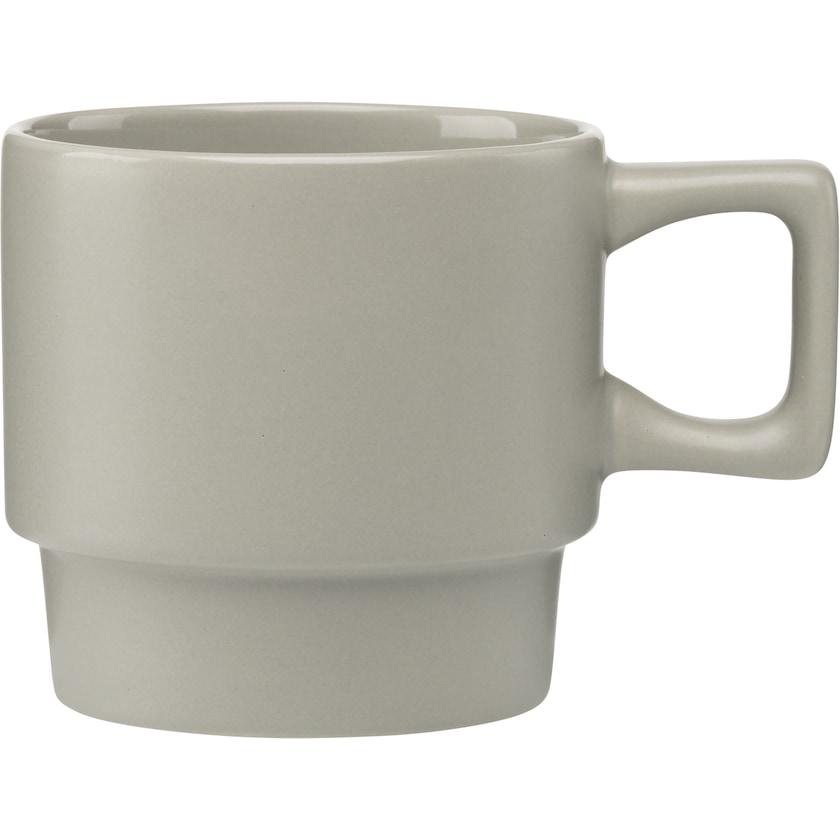 Kleiner, stapelbarer Becher mit elegantem Entwurf. Der Becher Durant ist aus hochwertiger Keramik gefertigt. Er verfügt über eine matte Außenseite und eine glänzende Innenseite. Der Becher passt in die meisten Kaffeemaschinen. Spülmaschinenfest.